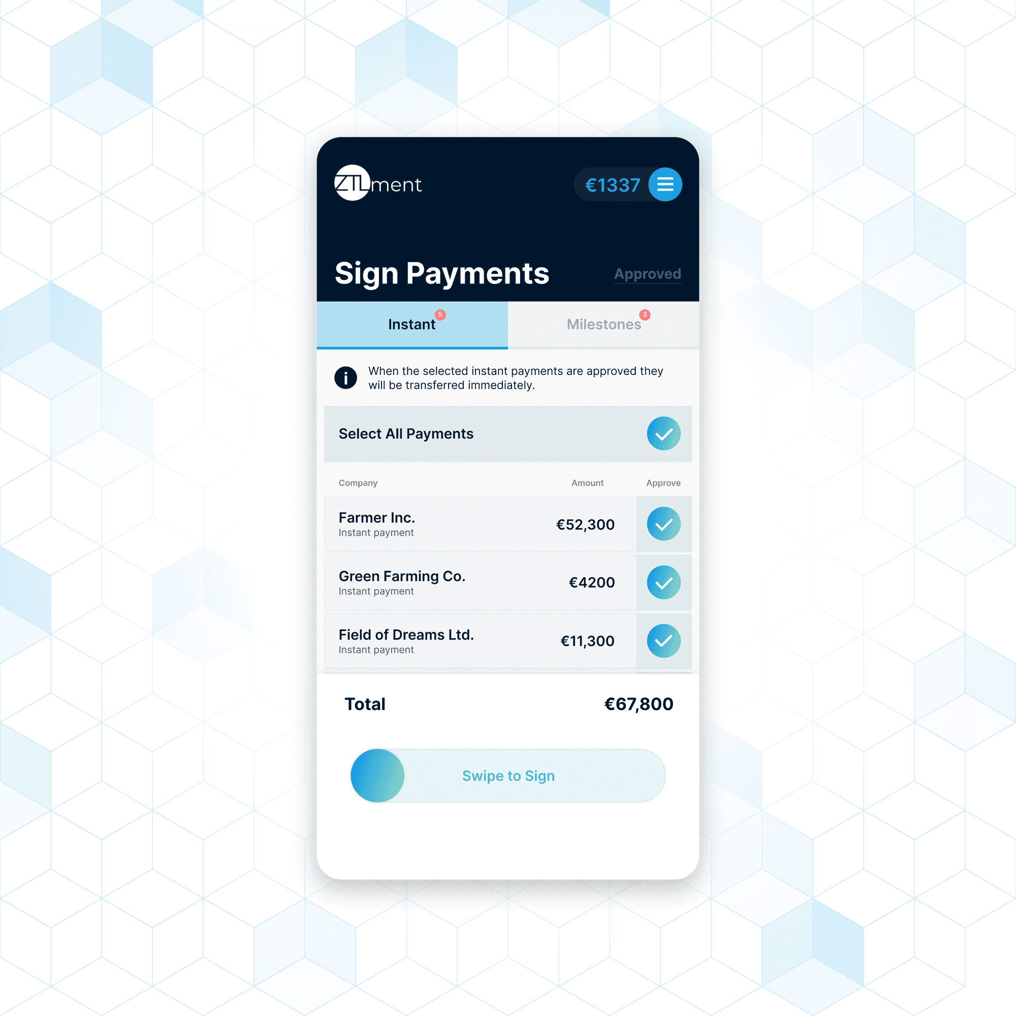 ZTLment enables finance teams to easily build 4-eyes approval flows, customize permissions and even lets you sign off on future payments that will be triggered once specific conditions are met.